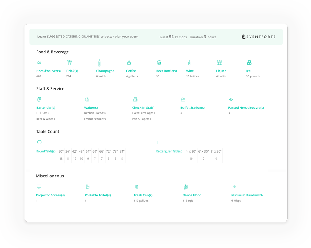 Just enter your number of guests and the duration of your event to get started with this free tool. You'll get suggested catering estimates for your event in a matter of seconds (saving yourself hours of manual calculation)!
